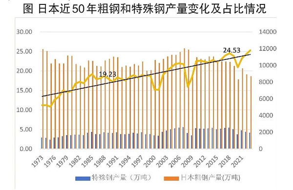 设备、汽车、家电的更新,关系民生的新型基础设施建设以及推进城市化建设将对钢材的强度、轻量化、耐腐蚀、长寿命等方面提出新要求。虽然未来我国钢材需求总量将长期处于平稳或者缓慢下降趋势,但产品结构会一直跟随下游用户需求趋势进行调整。例如日本近50年粗钢产量几乎维持在1亿吨左右,但特殊钢产量在增加,普通钢产量在减少,产品结构一直在变化。